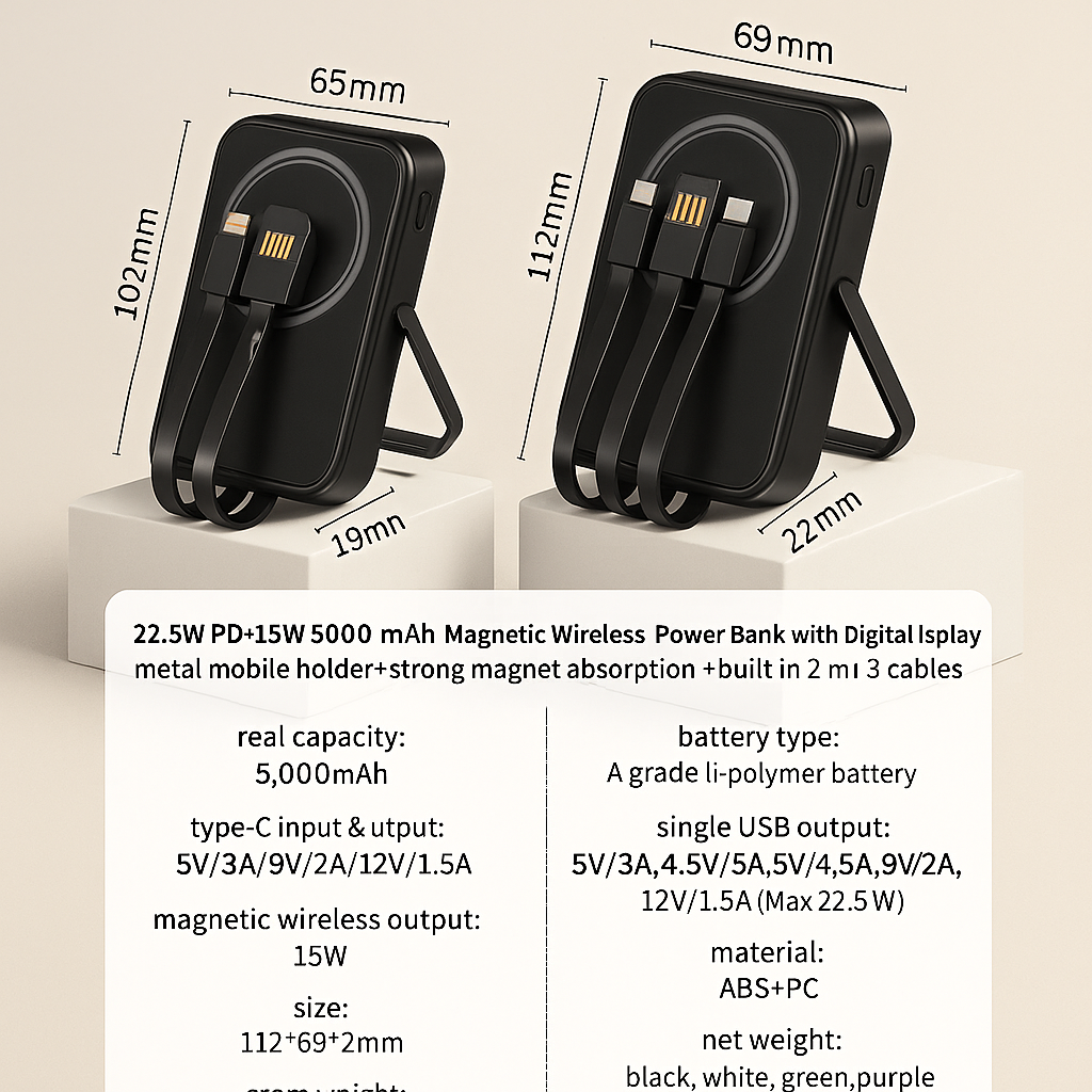 - كابلات مدمجة (Lightning – Type-C – Micro USB)